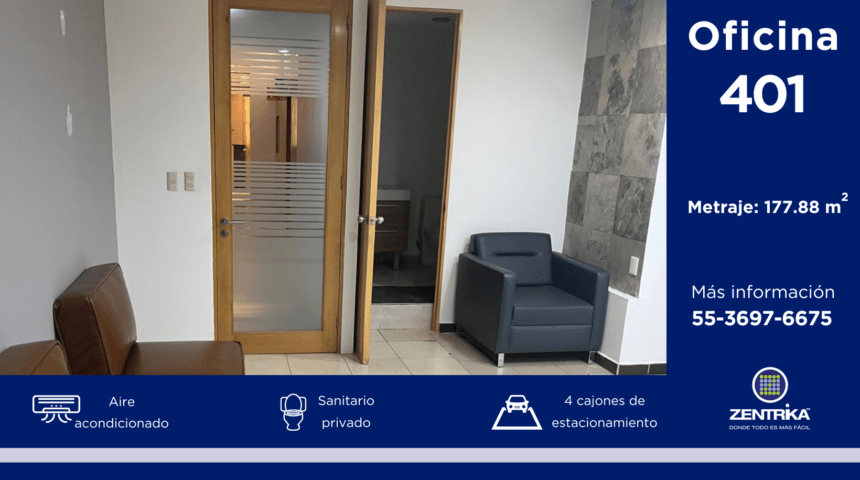 Oficina con cuatro espacios para oficinas privadas y/o consultorios. Se otorgan cuatro cajones de estacionamiento que pueden ser utilizados por los usuarios de la oficina (miembros del equipo). Cuenta con contrato de luz de CFE, un baño interno, piso e instalación de aire acondicionado.